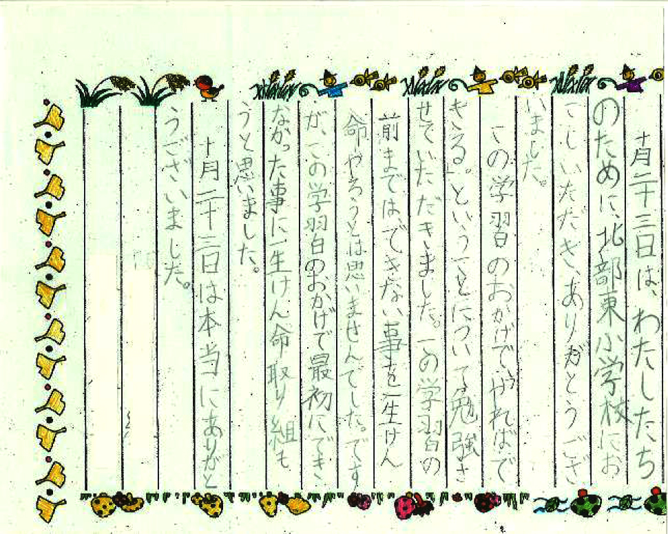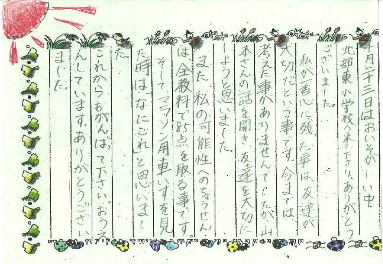熊本市立北部東小学校講演会報告 報告 X Facebook はてブ LINE Pinterest コピー 2018.11.062025.11.10 昨年に続き、熊本市立北部東小学校の講演に行ってきました。 今年は、4 年生が対象でした。皆さん熱心に行儀良く話を聞いていただきました。 また、話し終了後の質問コーナーでは、先生が指名するのが困るほど沢山の生徒 さんが色んな質問をしてくれました。 後日、生徒さんからの感想と激励を頂きましたのでご紹介します。